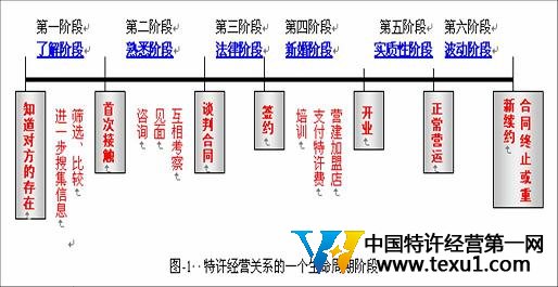 按照時間來劃分,我們可以把特許經營關系的一個生命周期劃分為六個階段,其七個標志性劃分點分別是(1)知道對方的存在;(2)首次接觸;(3)談判特許經營合同;(4)簽訂特許經營合同;(5)加盟店開業;(6)加盟店正常營運;(7)雙方特許經營合同終止或重新續約。