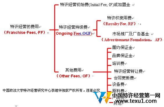 相對地,開設一家加盟店的話,盟主所能賺取的收入來源就是特許經營費用的三大類,眾多小類。具體見下圖: